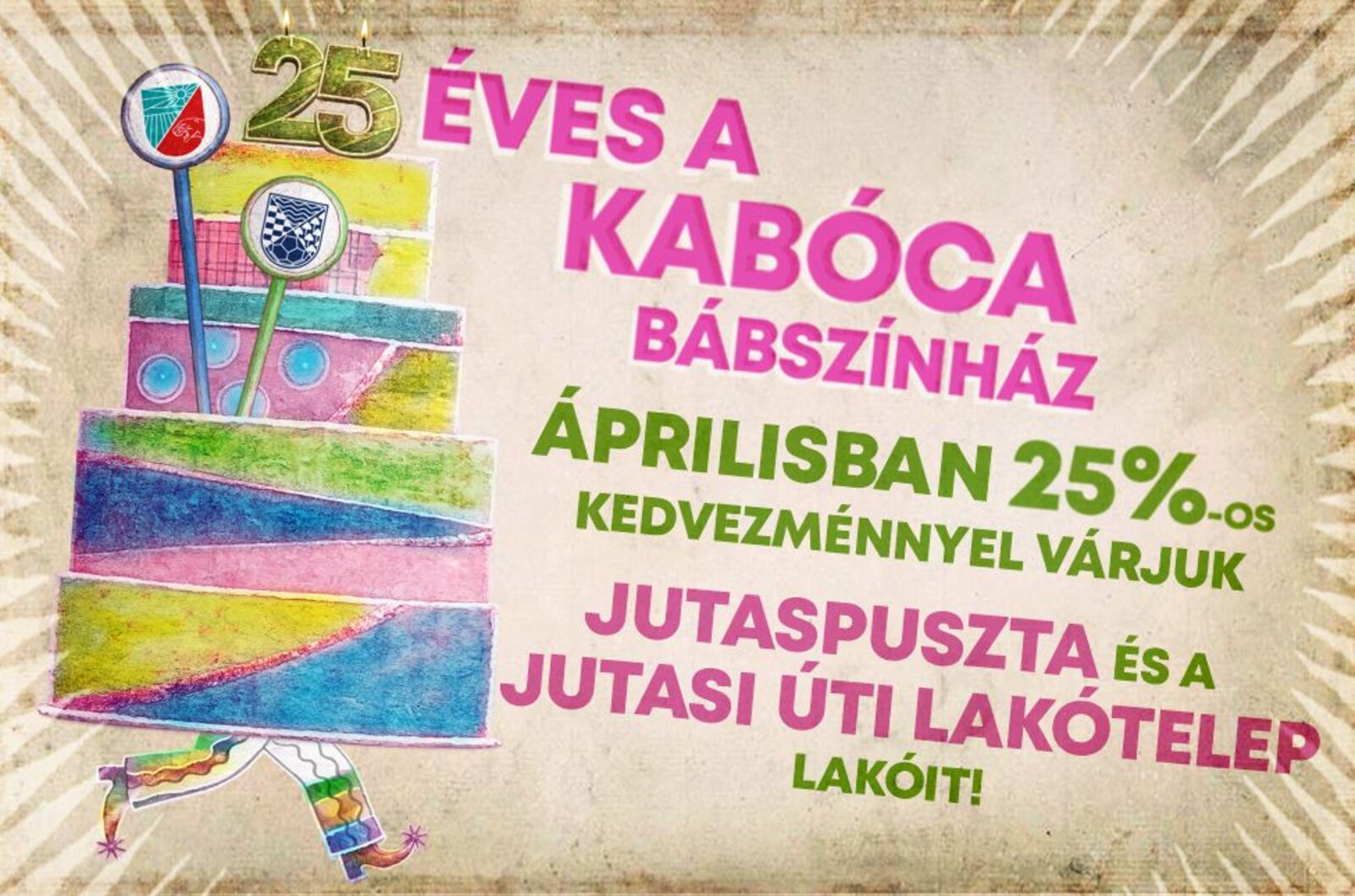 A Kabóca Bábszínház 25 éve hivatalos társulat Veszprémben, születésnapunk alkalmából egész éves kedvezményt hirdetünk. Szeretnénk megköszönni Veszprém városának és a veszprémieknek, hogy otthonra leltünk nemcsak a Deák Ferenc utcai épületünkben, de az emberek szívében is.